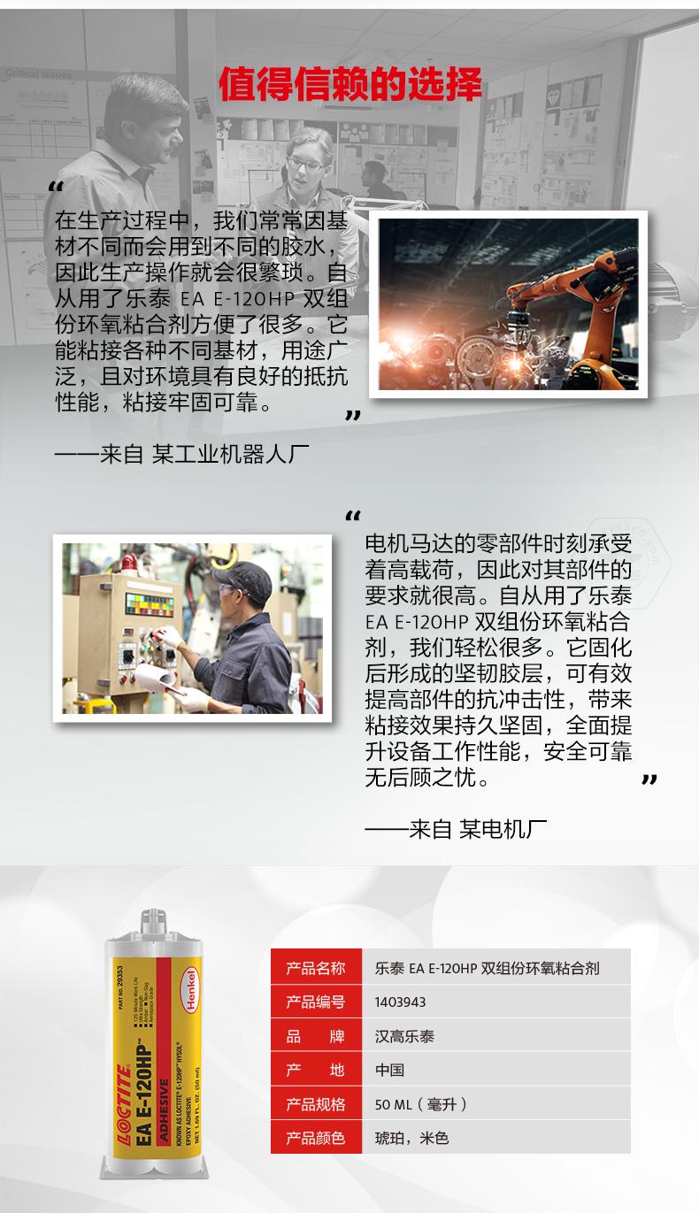 乐泰EA E-120HP双组份环氧粘合剂是一款双组份、通用型、具有高抗剥离性的工业级环氧树脂胶粘剂。乐泰EA E-120HP双组份环氧粘合剂具备耐候性、耐冲击和耐溶剂性能,可用于铝、钢和其他金属,以及各种塑料和陶瓷的粘接。乐泰EA E-120HP双组份环氧粘合剂适合需要高冲击力和高剥离强度的低应力、一般工业应用。