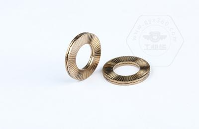 • 产品描述:双叠自锁防松垫圈是由两片成对组成,外侧带有放射状斜度细齿,而内侧为斜度角更大的射状宽齿面(垫圈)。宽齿面角度大于螺栓螺纹角度,再装配时内侧斜齿面是相对的,外侧放射状齿面与两端接触面成咬合状态,当连接件受到震动并使螺栓发生松动趋势时,仅仅允许两片垫圈内侧斜齿间相对错动,产生张力抬升,从而达到100百分之百的阻止松动。